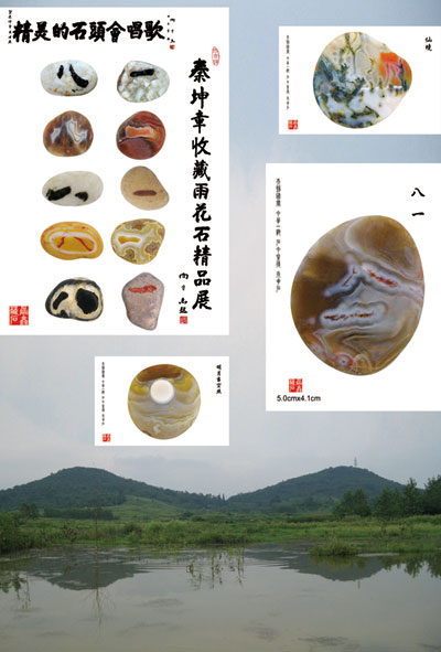 如今,秦坤章夫妇收藏的雨花石精品有近千枚、珍品有200多枚,与军事题材相关的已有数十枚。已在省、市获各种奖项的名石有30多枚。2001年底在山东泰山举办的“中国泰山国际奇石大展”上,他收藏的雨花石《人》、《郑和下西洋》获得金奖。有些藏石甚至被有关党政领导作为礼品,赠送给连战、吴伯雄等国内外来宾。