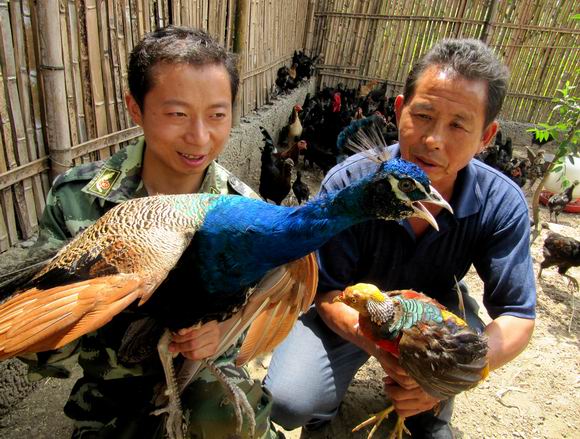 鄢跃斌(左)在展示他饲养的蓝孔雀