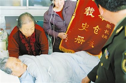 部队领导把锦旗送到老英雄病床前