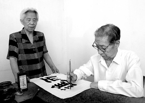 廖贻训在家中用伤残的手书写条幅。