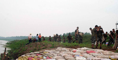 曾参加98年江西九江抗洪的战士重返九江,在高温下连续作战加固出现滑坡险情的江洲大堤。