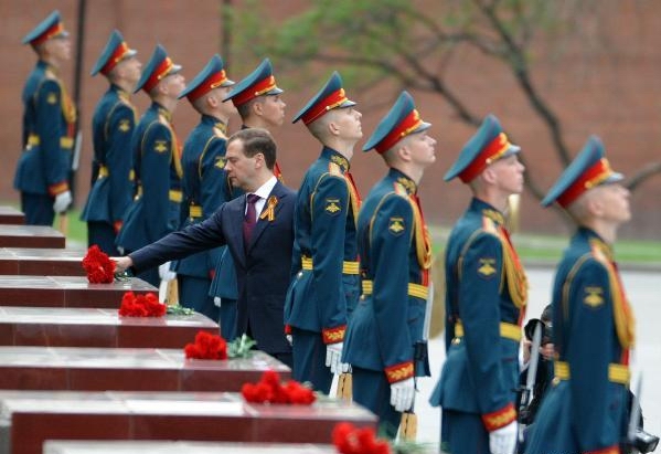 5月8日,卫国战争胜利日前一天,俄罗斯总统梅德韦杰夫在莫斯科向无名烈士墓敬献花环。
