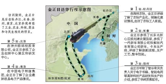 访问期间,金正日先后在牡丹江、长春、扬州、南京、北京参观考察了工业、农业、科技、商业和与民生相关的项目。