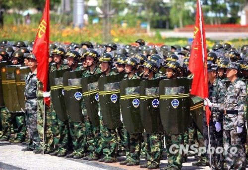 资料图:新疆乌鲁木齐市的民兵预备役官兵举行入队宣誓大会,这些民兵将担负一线维稳任务。
