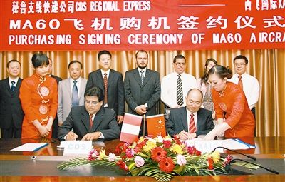 继成功运营亚洲、非洲、南美洲14个国家上百条航线后,MA60飞机海外销售又取得新突破,5月20日,秘鲁CDS支线快运公司与中航工业旗下西飞国际签订4架MA60飞机购销合同。
