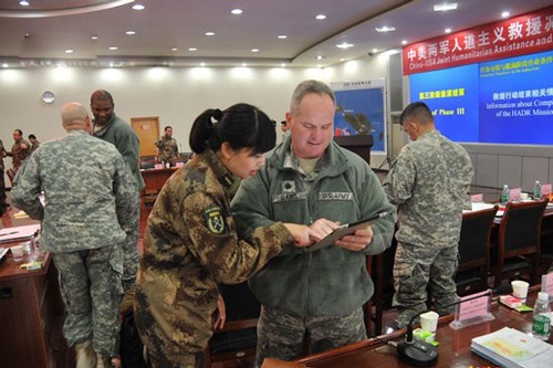中美两军人道主义救援减灾联合室内推演30日在成都军区某训练基地举行。