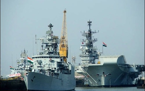 停泊在港口的印度海军“维拉特”号航母(右)及其他舰艇