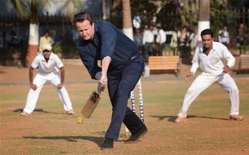 英国首相卡梅伦访印期间打板球显示亲民形象