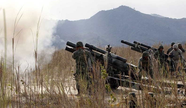 当地时间4月12日,美菲“肩并肩”联合军演在菲律宾打拉省的乌鸦谷训练场继续进行。美国和菲律宾双方都出了重武器装备并进行了实弹射击。图为菲律宾士兵在操作105毫米榴弹炮。