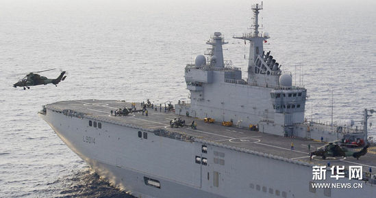 6月4日,航行在利比亚海域的法国海军一艘“西北风”级两栖攻击舰上搭载着“虎"式和小羚羊武装直升机。