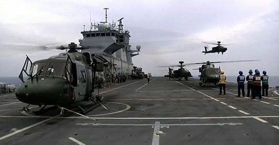 6月4日,地中海海域,英国皇家海军海洋号两栖攻击舰,一架远处阿帕奇起飞参与突袭利比亚,近处是一架山猫。