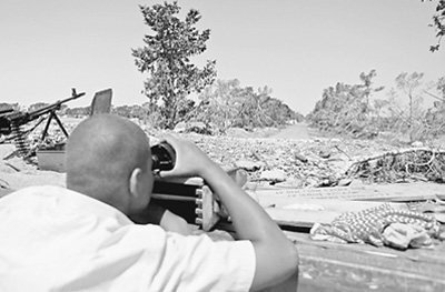 在利比亚的米苏拉塔前线,一名反政府武装人员在观察政府军动向。