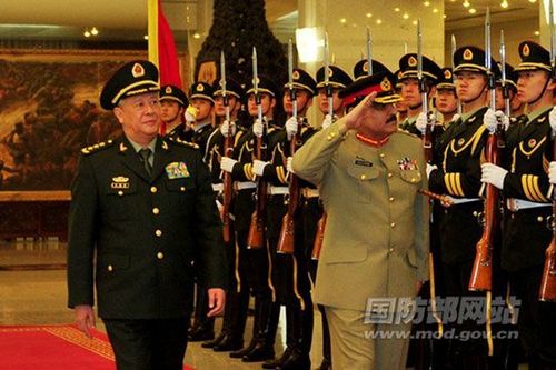 2月23日,中央军委委员、总参谋长陈炳德上将为巴基斯坦参联会主席哈立德·沙米姆·韦恩上将举行欢迎仪式,