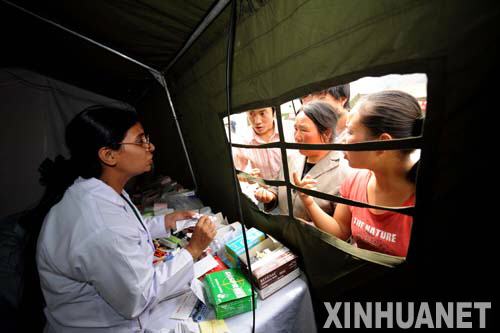 2008年6月2日,由28人组成的巴基斯坦医疗队5月29日到达甘肃省陇南市武都区后,在武都区城关镇搭建起由候诊室、诊断室、治疗室、B超室等组成的一个功能完备的“帐篷医院”,为当地受灾群众实施医疗救助。图为巴基斯坦医疗队队员在武都区城关镇为受灾群众讲解药品的用法。