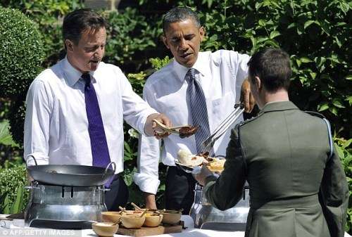 奥巴马卡梅伦成“服务生” 为老兵烤肉夹菜