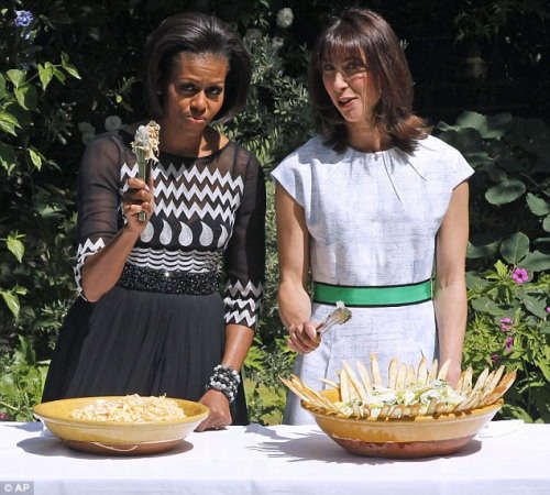 奥巴马卡梅伦的夫人在烧烤餐会中负责提供沙拉等食物