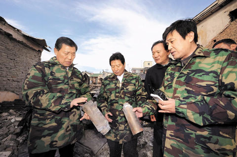 11月24日,访问延坪岛的大国家党议员黄震夏、安商守、朴商银和安亨奂(左起)等人将漆黑的保温瓶误认为炮弹,正以严肃的表情查看。