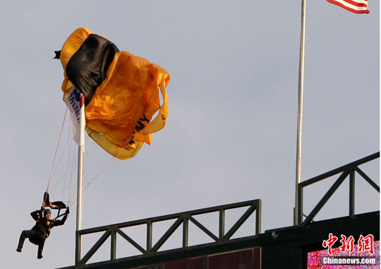 一名美国陆军伞兵从德克萨斯州阿灵顿上空跳伞,原本预计着陆在一块空地,结果降落伞被棒球场边的旗杆勾到,被挂在了旗杆上。