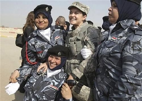 资料图:伊拉克女警察在毕业典礼上与美军女教官合影。