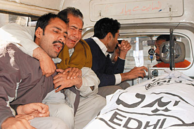 其中一名巴基斯坦死者的遗体送往停尸间时,亲人在一旁痛哭。