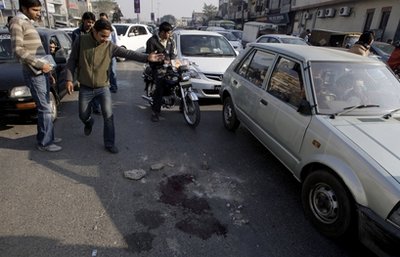 巴基斯坦民众在事发现场查看地上的血迹