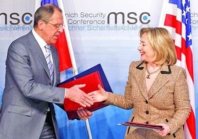美国国务卿希拉里·克林顿和俄罗斯外长拉夫罗夫当地时间5日在德国慕尼黑交换了《削减和限制进攻性战略武器条约》签署文本,美俄新的核裁军条约正式生效。