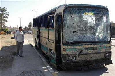 1月23日,巴格达一名居民在卡迪米亚区经过一辆被炸毁的公共汽车。