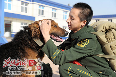 曹妃甸边检站老兵刘剑临行前和自己豢养的警犬依依不舍。