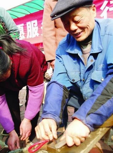 今年57岁的王建发是退伍军人,也是铁匠传人,磨剪刀是他的强项。昨天,他也加入志愿者队伍,一个上午磨了近百把剪刀。