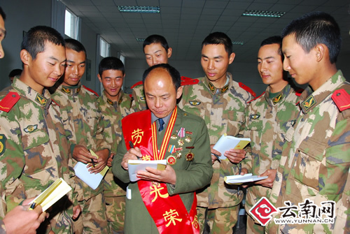 报告结束后,身披绶带,胸前挂满奖章的段其海被武警新战士围在了中间,纷纷要求段老兵给他们签名并合影留恋。段其海以一名老兵的身份与新战士进行了亲切的交流,引导新战士在部队安心服役,在平凡岗位上建功立业。“希望我们的新战友,尽快地适应部队的生活,不辜负当兵时父老乡亲的重托,争做一名合格的武警战士,为玉溪经济社会发展建功立业。”他对新战士寄予了希望和勉励。