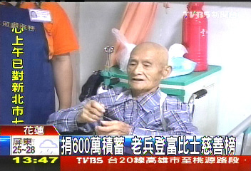 台湾花莲县82岁的退伍老兵洪中海,将600万新台币的毕生积蓄全部捐出,近日荣登亚洲慈善英雄榜。