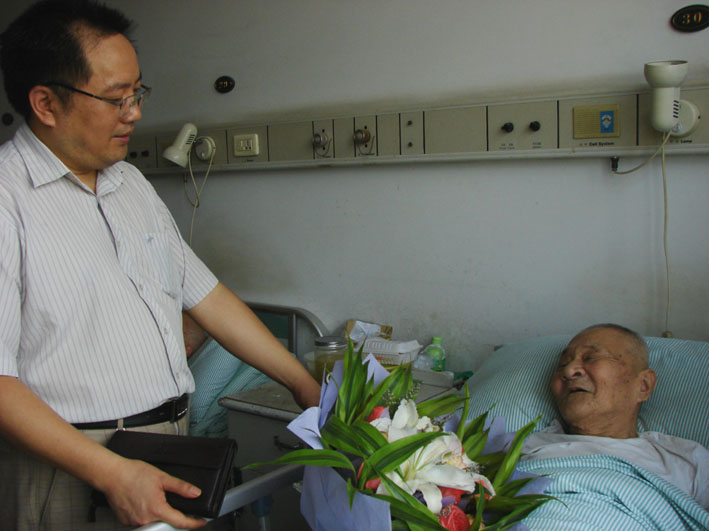 2009年7月18日,在酷热难耐的南京城里,带着真诚与关爱,《老兵》杂志与中国老兵网的领导及记者到医院探望了29军抗日老兵李鸿斌。