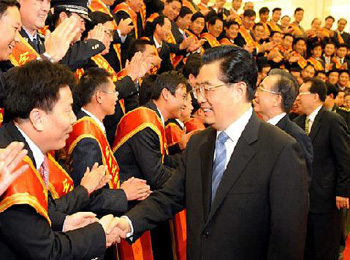 中国老兵网讯 昨日,全国优秀复员退伍军人表彰大会在北京举行。会前,中共中央总书记、国家主席、中央军委主席胡锦涛,中共中央政治局常委、国务院总理温家宝,中共中央政治局常委李长春,亲切会见受表彰的全国优秀复员退伍军人。