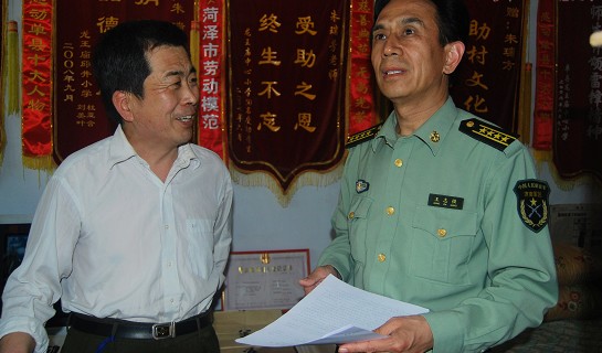 “你是全市退伍军人的一面旗帜,是创建和谐社会的道德标兵!”日前,菏泽市委常委、军分区政委王志强专程来到单县龙王庙镇,看望慰问了“山东省道德模范”、优秀退伍军人朱瑞方。40年来,朱瑞方省吃俭用,坚持用微薄的收入,资助207名贫困学生完成学业。其间,他向学生捐资14万多元。受他资助的学生先后有59人考上大学,33人走上了工作岗位。