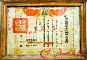 昨日,记者来到南湾公园大街12号麦维长的家中,大厅墙上的正中,是几位伟人的画像,右下方用镜框裱着的《革命军人证明书》格外显眼。记载着麦维长1949年2月参加人民解放军39军115师炮兵营机枪班工作,落款为解放军四野兼中南军区司令员林彪,政治委员罗荣桓、邓子恢、谭政,政治部主任陶铸。