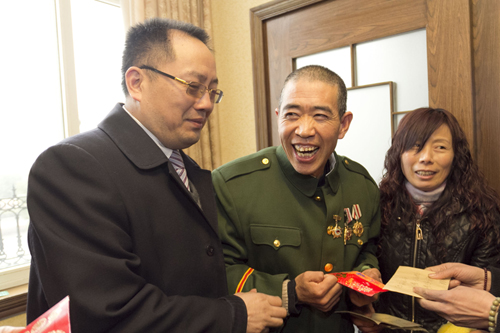 同去的几位战友,纷纷向刘兴腾敬礼,并送上新年祝福和慰问金。中国老兵网还为刘兴腾赠送了两份保健品“蒋氏高能蛋”。
