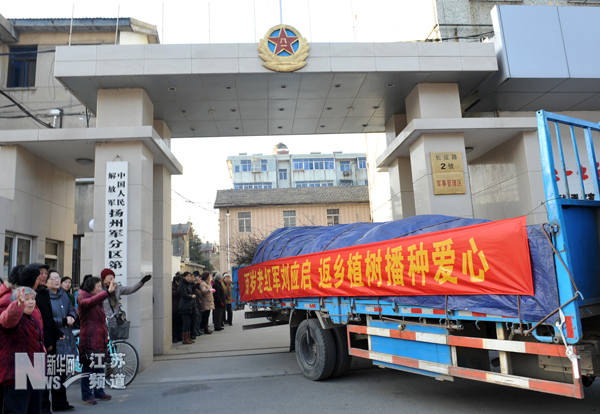 新华网江苏频道南京3月12日电 植树节到来,扬州军分区第一离职干部休养所102岁的老红军刘应启,自费购买一卡车(100余株)樱花树苗,在干休所工作人员和家人的陪同下,返回家乡植树。老红军刘应启出生于1911年,1930年参加中国工农红军,1933年加入中国共产党,曾参加二万五千里长征。(庄文斌 摄)
