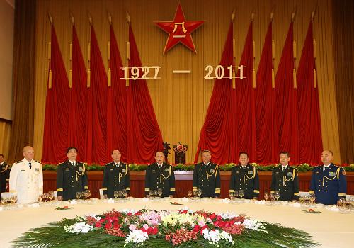 7月31日,中华人民共和国国防部在北京人民大会堂举行盛大招待会,热烈庆祝中国人民解放军建军84周年。中央军委委员、国务委员兼国防部长梁光烈上将,中央军委委员、总参谋长陈炳德上将,中央军委委员、总政治部主任李继耐上将,中央军委委员、总后勤部部长廖锡龙上将,中央军委委员、总装备部部长常万全上将,中央军委委员、第二炮兵司令员靖志远上将,中央军委委员、海军司令员吴胜利上将,中央军委委员、空军司令员许其亮上将出席了招待会。