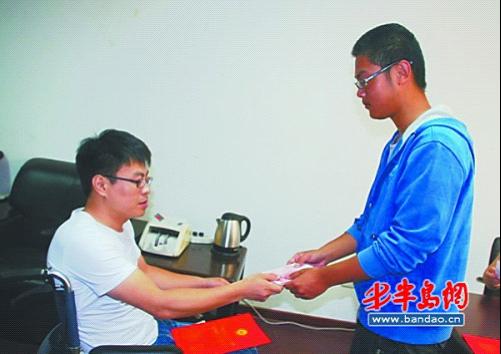 残疾人在社会上本就是需要关注和关心的弱势群体,但有这样一位残疾人,他不仅通过自己的努力打拼出一份事业,近期又资助了一位因家庭贫困上学困难的大学生。他就是现年33岁的一级伤残退伍军人蔡池茂 。近日,记者从胶南市慈善总会了解到,蔡池茂通过胶南市慈善总会已经将第一年的学费5000元交到了资助学生赵鹏手里。