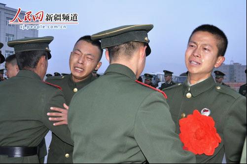 新疆伊尔克什坦边检站老兵退伍 战友情深拥抱泪