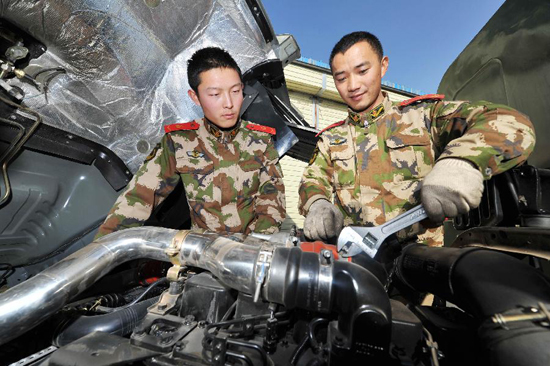 11月16日,在武警宁夏总队直属支队的营地内,汽车班即将退伍的战士(右)在向战友传授如何拆卸汽车发动机。随着每年老兵退伍时节到来,武警宁夏总队即将退伍的老兵积极发挥传帮带作用。在汽车房、训练场、后厨和宿舍内,每天都有老兵向战友传授各种技术和经验的身影。新华社记者 彭昭之 摄