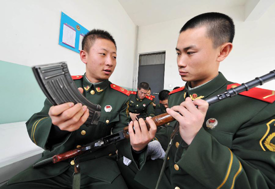 11月16日,在武警宁夏总队直属支队的营地内,警勤中队即将退伍的老兵(左)在宿舍内教战友拆卸枪支。随着每年老兵退伍时节到来,武警宁夏总队即将退伍的老兵积极发挥传帮带作用。在汽车房、训练场、后厨和宿舍内,每天都有老兵向战友传授各种技术和经验的身影。新华社记者 彭昭之 摄