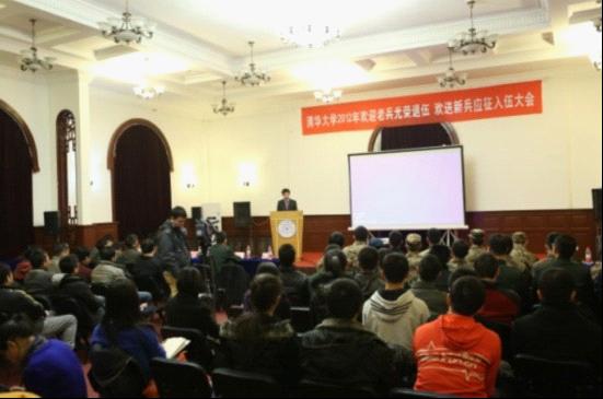 2012年冬季征兵工作中,学校加大了宣传力度,大力宣传优秀入伍士兵的先进事迹,激发了同学们的入伍热情。有20多名同学报名参军,经过体检和政审,有13名同学(含2名研究生)应征入伍。五道口金融学院研究生李冲代表入伍新兵上台发言,他表示一定会坚定信念,接过老兵的接力棒勇往直前,展现出清华人的风采。