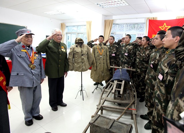 1月30日下午,86岁老兵何基、85岁老兵陈敏学带着上甘岭战斗中穿过的棉衣、淮海战役中使用过的独轮车等战争物件来到广东边防七支队新兵团,用实物为新兵讲述战争年代艰苦奋斗的故事,勉励新兵继承传统,勤俭节约、艰苦奋斗,当好革命军人的接班人。