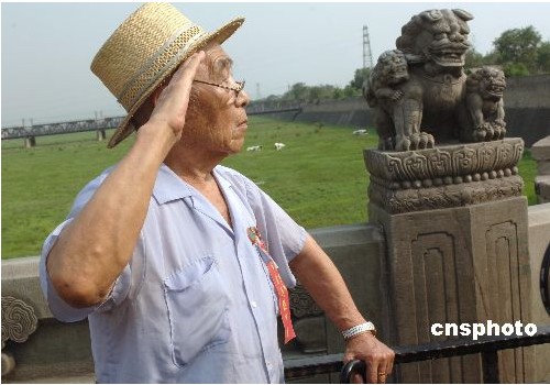 七日上午,被烈日烤透的卢沟桥上,九位佝背的耄耋老人齐刷刷向桥上石狮的方向行了一个军礼。然后,立正、稍息、报数,就像七十年前他们在这里当二十九军守兵时一样。