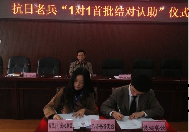 今日下午,由民革常德市委、常德晚报、常德1+1爱心联盟、常德会战研究会发起的"关爱抗战老兵行动"首批结对认助仪式举行,13名爱心人士与发起单位现场签订了结对承诺书。爱心人士承诺,每年将向结对抗战老兵捐资1000元、至少2次登门看望慰问,直到抗战老兵去世。