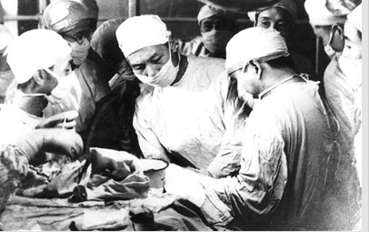 上图:1958年5月,涂通今博士(中)主持我国首例经小脑幕上入路切除听神经瘤手术并获成功