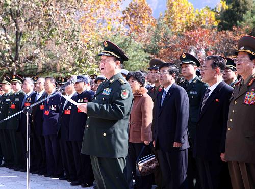 10月24日,在朝鲜平安南道桧仓郡志愿军烈士陵园,中央军委副主席郭伯雄(前)在祭奠仪式上致辞。当日,中央军委副主席郭伯雄率中国高级军事代表团全体成员前往朝鲜平安南道桧仓郡志愿军烈士陵园祭奠烈士,缅怀所有长眠在朝鲜的志愿军烈士们的业绩。正在朝访问的志愿军老战士代表团全体成员和解放军文艺代表团的代表以及中国驻朝机构人员也一同前往出席祭奠仪式。