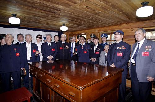 10月24日,在朝鲜平安南道桧仓郡,中国志愿军老战士代表团成员在志愿军司令部旧址参观。