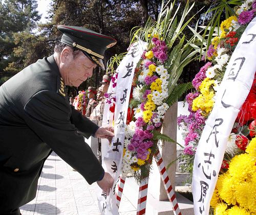 10月24日,在朝鲜平安南道桧仓郡志愿军烈士陵园,中央军委副主席郭伯雄在毛岸英陵墓前整理花圈。